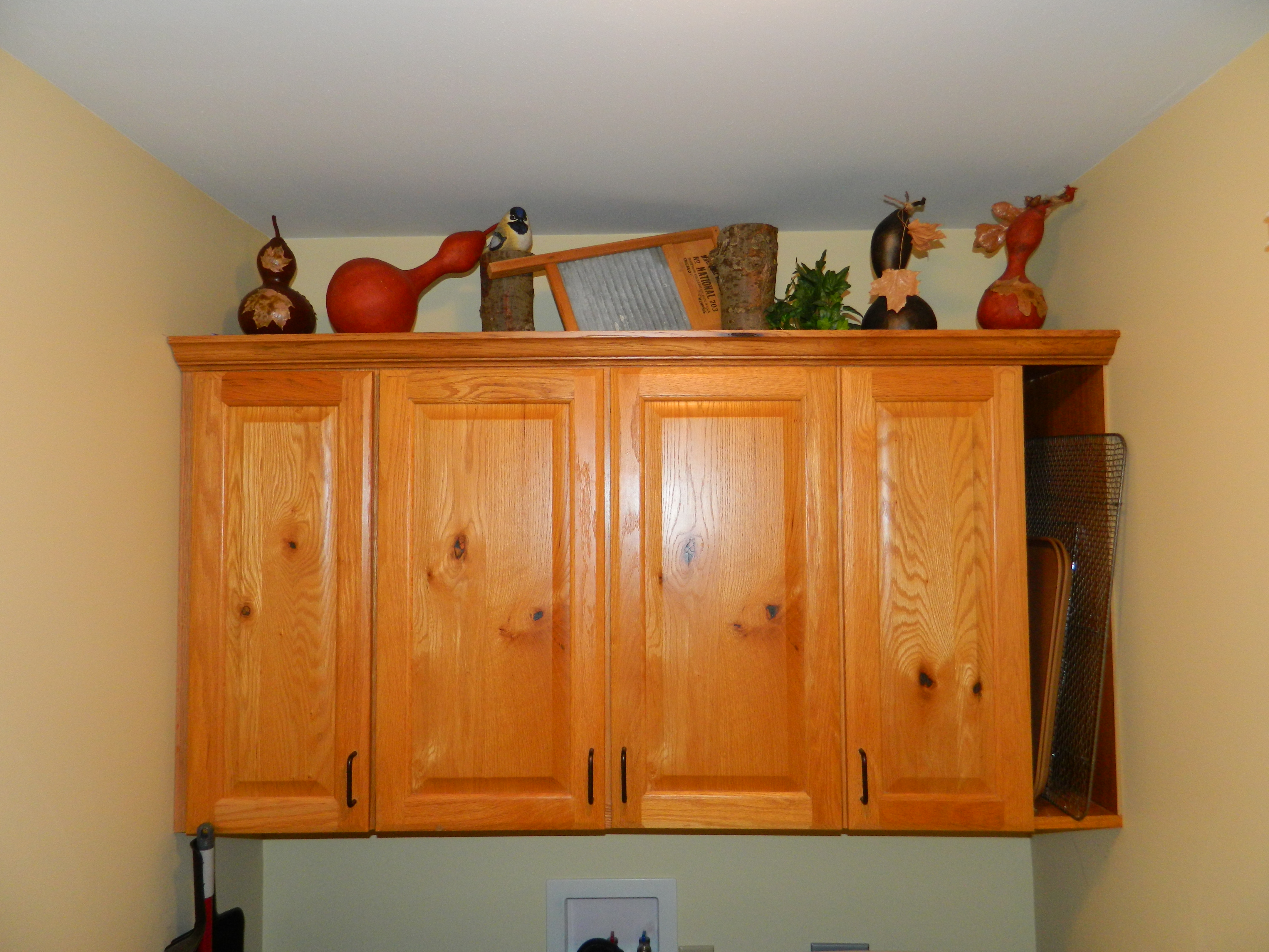 Below: The rest of the cabinets that were not used for the Hospitality Bar were hung in the utility room. Instead of using wood filler for the dead space (on right) I had a bottom shelf and right side panel added for storing trays and cookie cooling racks. We added crown molding at the top to dress it up. I considered using the top for storage but only considered. It looked much prettier decorated with the gourds A.J. grew and I painted.