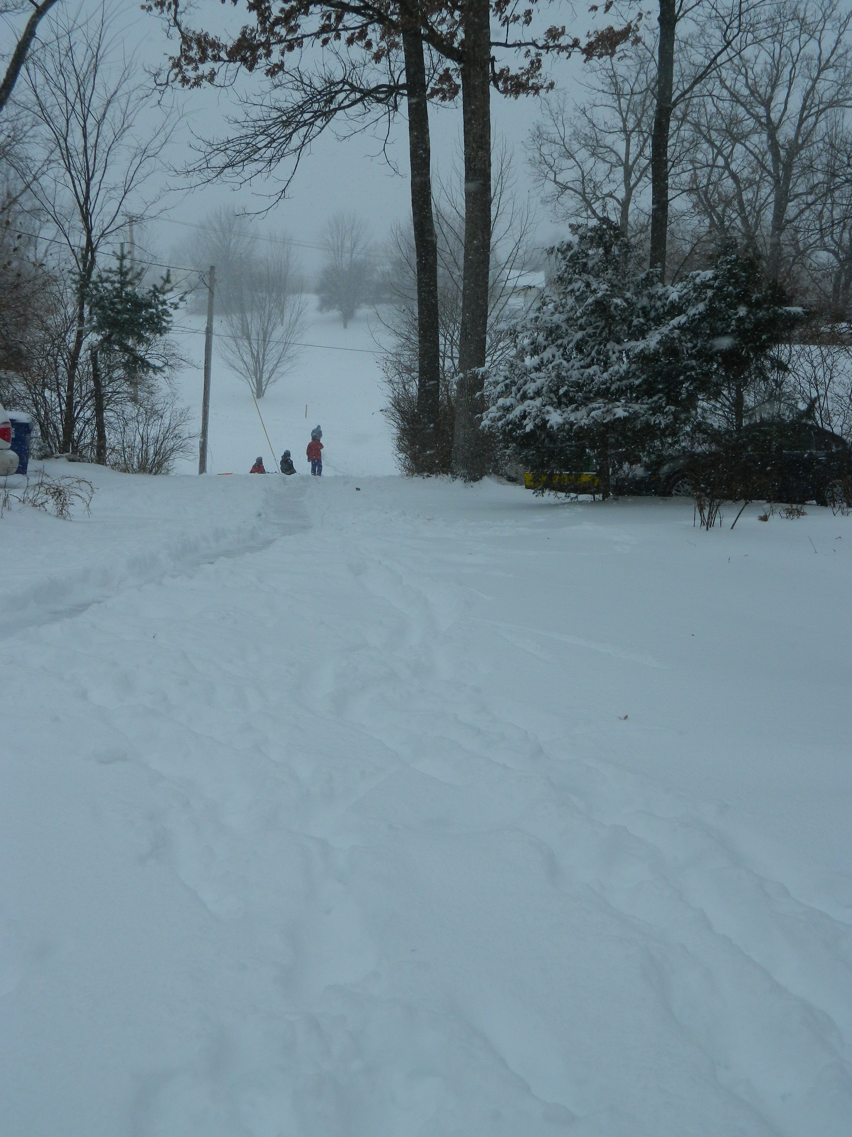 Getting ready to sled down our long steep driveway. The snow plows have not been here since earlier in the morning due to drifting snow so no cars on the road.
