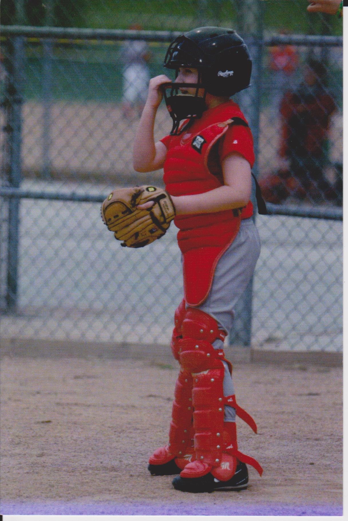 It happened like this: Last year at the beginning of the season, Farm Boy, who was one of the coaches picked up the baseball gear from the association. Everyone on the team was new to baseball, except my boys, and since we had the gear A.J. suited up and practiced catching at home. That is how it happened.