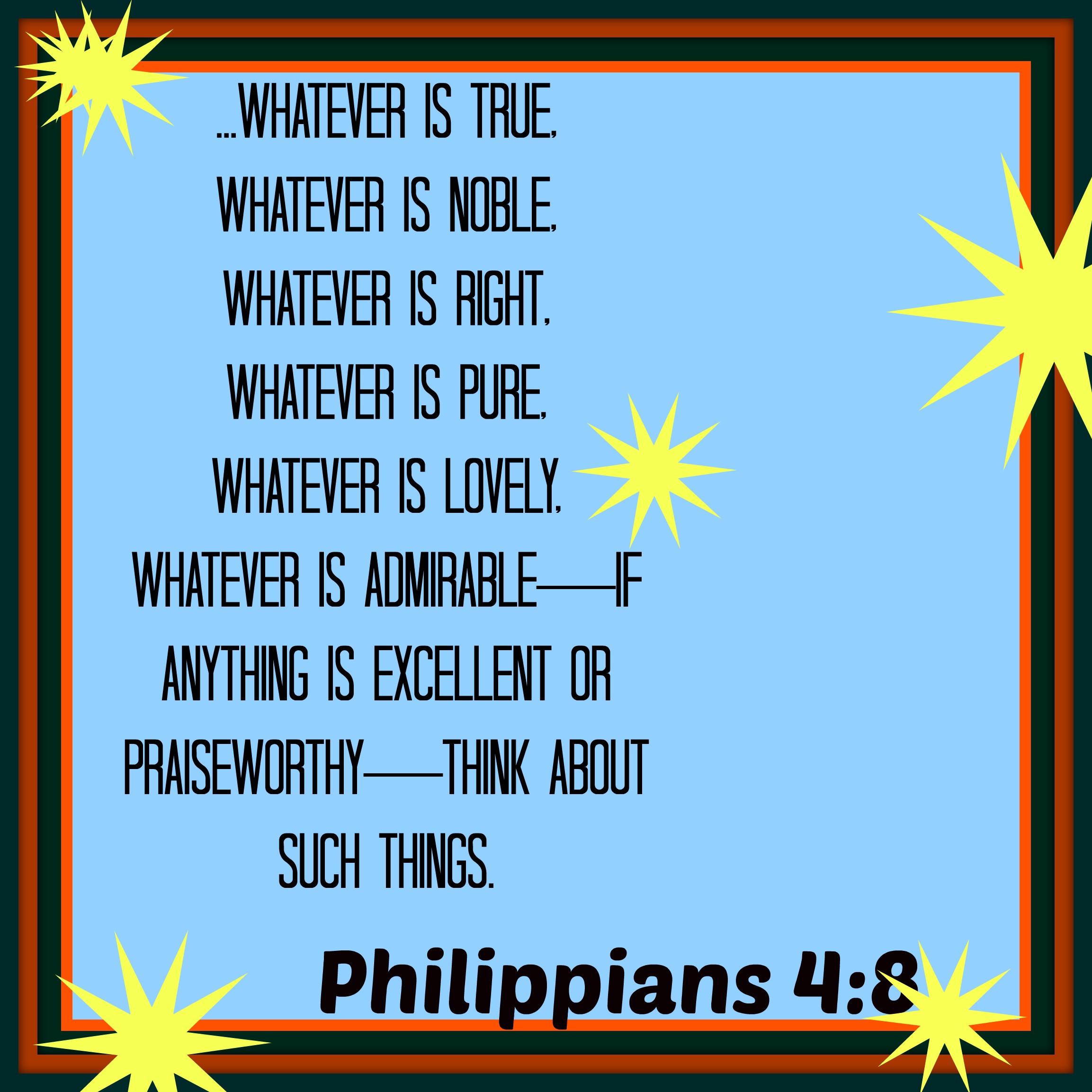 Do NOT give your thought life over to the negative thinkers. Do you tend to be like a hampster running on its little wheel—the thoughts keep turning over and over in your mind? Stop it! Jump off! Give it to God and focus on His truth.