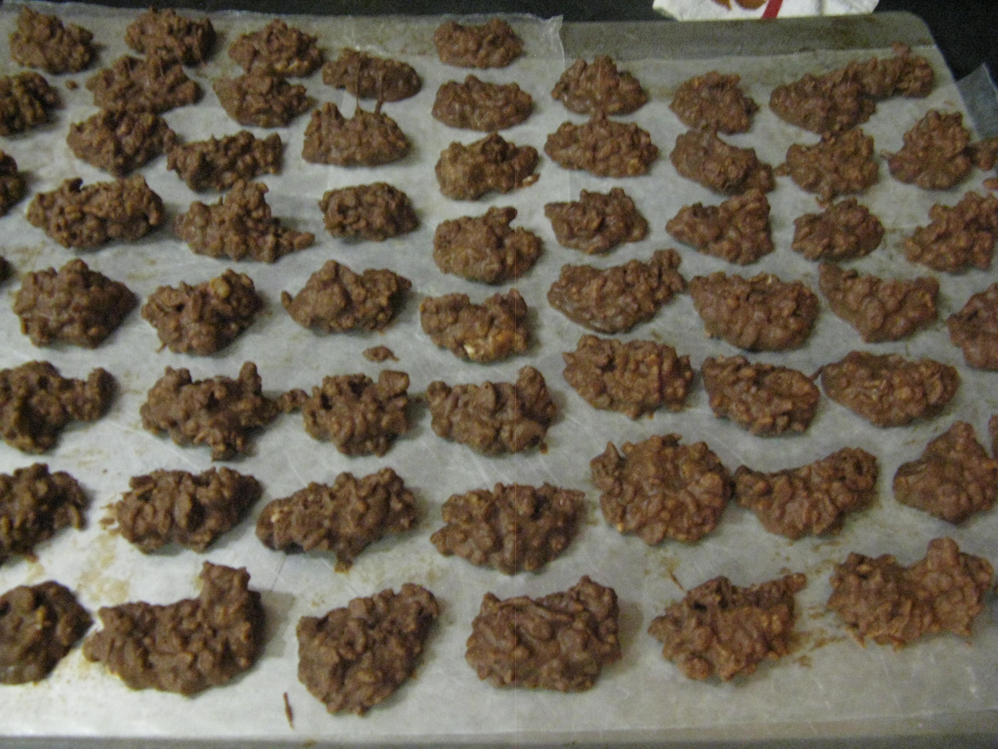Keep clusters close together but not touching. Place trays in fridge or freezer for quick set time. When set, peel clusters off of paper and place in airtight containers.