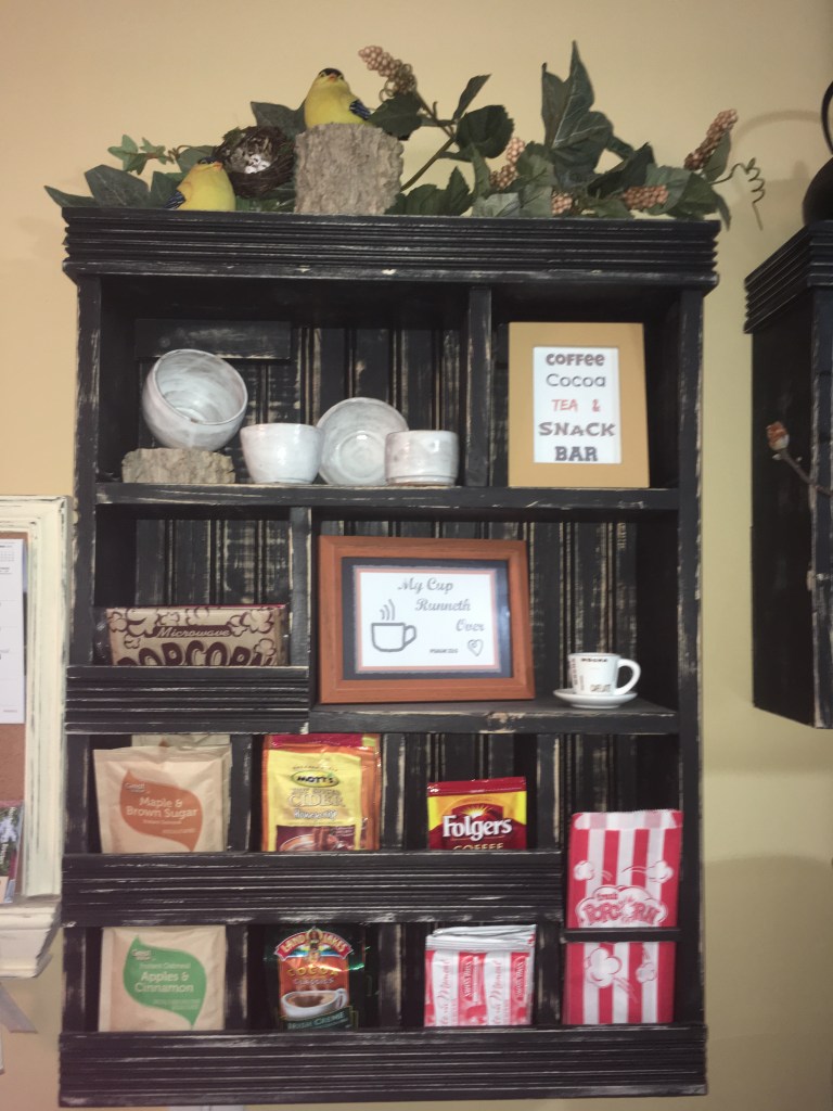 Our family has since moved, and our new house didn’t have a built-in nook for a hospitality station, so I built one. It coordinates with the other rustic and primitive tables and shelves we have in our home. Above is the finished product. There was an abundance of lumber left over from our new home build.